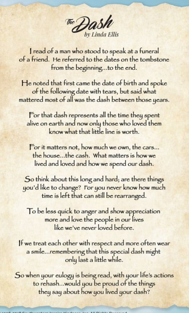 “The Dash” represents a person’s life between the time of one’s birth until the time of their death. It’s the part of our lives that matter most.