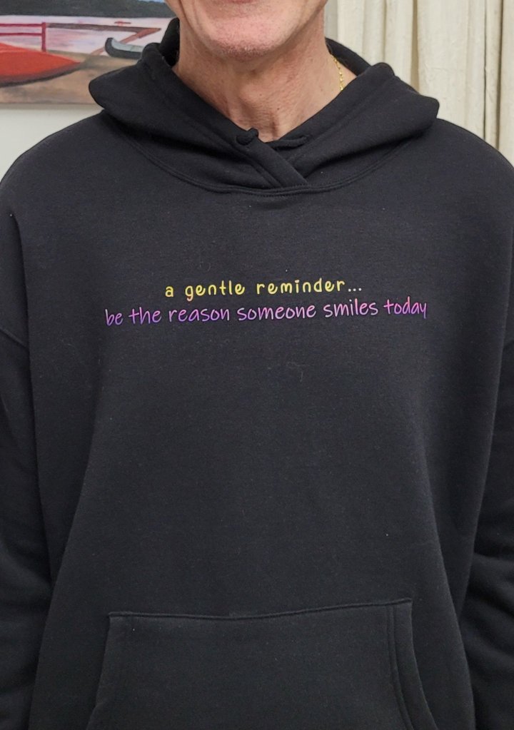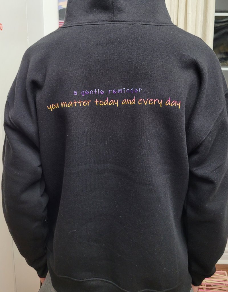 I have put together a list of gentle reminders and affirmations which you can see and choose from in the pictures attached (with many more to come). Each sweatshirt (hoodie) will be handcrafted by me with love (and lots of technical support and tlc from Rich!) and will include one gentle reminder on either the front or back side of shirt (your choice) along with my loving signature/mantra “You Are Enough” to be placed nearest to the cuff on the left sleeve (see pic).