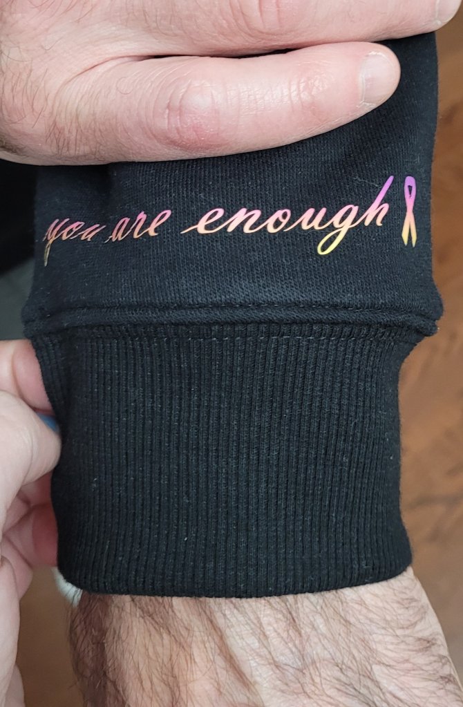 Wear this handcrafted hoodie made especially for you by me! Wear it with pride and carry a message of positivity with you wherever you go and help brighten up someone’s day. Every item includes my signature/mantra “you are enough” on the left sleeve.