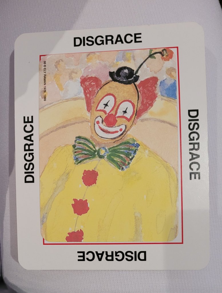 I chose first and immediately upon revealing my cards to myself I felt an overwhelming sense of defeat. It almost felt laughable in my mind. I didn’t want to share my interpretation with the group. I couldn’t see anything positive in the word “disgrace” or in a picture of a clown who was seemingly staring at me with a big smirk on its face and pity in his eyes; that was however until one of the guests in attendance (who happens to also be a psychotherapist) helped me see my cards in a whole different light.