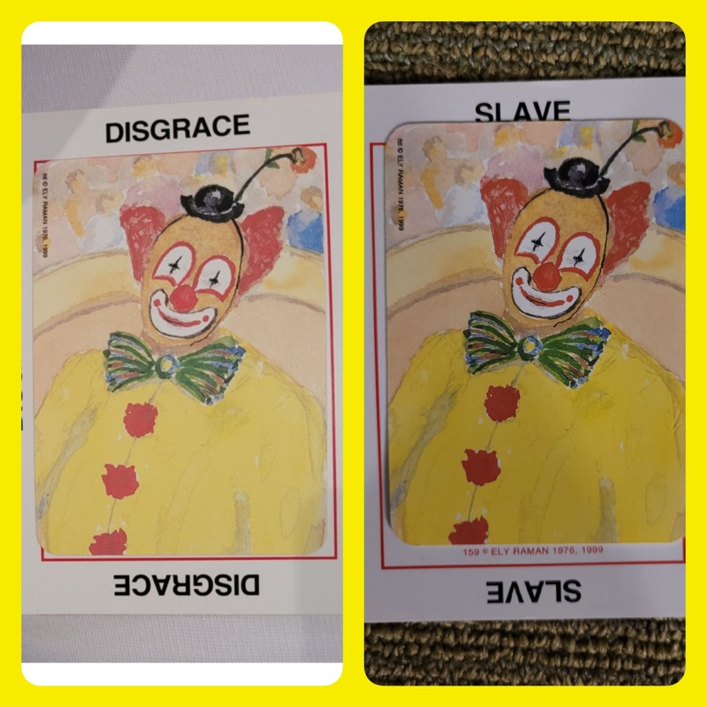 Like in June, we each started off the evening by picking two random cards from a deck of spiritual cards. One card with a word written on it, the other, a picture. We were to use the combination of the two cards together as part of our share, giving our own interpretation as to how they connect to our journey. I had a really hard time doing this the last time (see blog; https://youareenough712.wordpress.com/2022/06/13/oh-monday-motivation/). My word had been “disgrace” and my picture was that of some silly faced clown. This time around I picked the word “slave” which I easily interpreted as me feeling as though I have been a slave to my disease for the past 8 plus years but if you can believe it, somehow, in that big, shuffled up deck of cards, I blindly chose the exact same picture card again. What are the odds of this actually happening? It’s gotta mean something, right?? I mean, what could this silly faced clown really be trying to tell me??