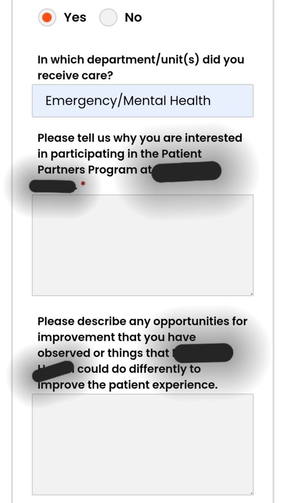 We chatted for about 15 minutes while on my lunch break at work where she collected further information from me and apologized several times for how I was treated (by the police as well). She then told me that with both my lived experience and my passion for mental health advocacy she thought I’d be a great fit for their “Patient Partners Program” and that I should go to their website and submit an application; which I did later that evening.