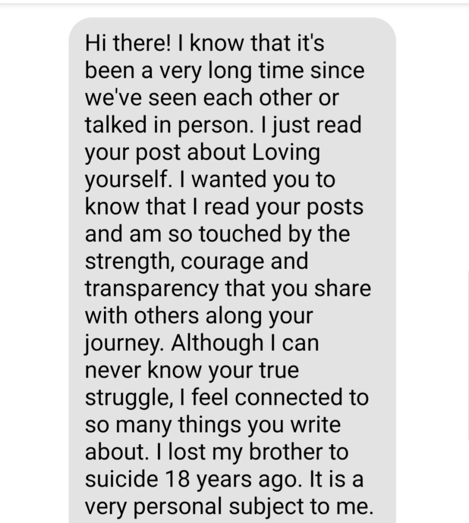 It’s opened up space to have real and honest relationships with people who can truly accept my limitations and vice versa, who see me as perfectly imperfect and vice versa, who don’t question my boundaries and vice versa, who support my endeavors and vice versa, who want nothing more than for me to be happy and vice versa, who are there to listen when I just need to talk, without judgment and vice versa and most of all, who love me for being my true authentic self and vice versa.